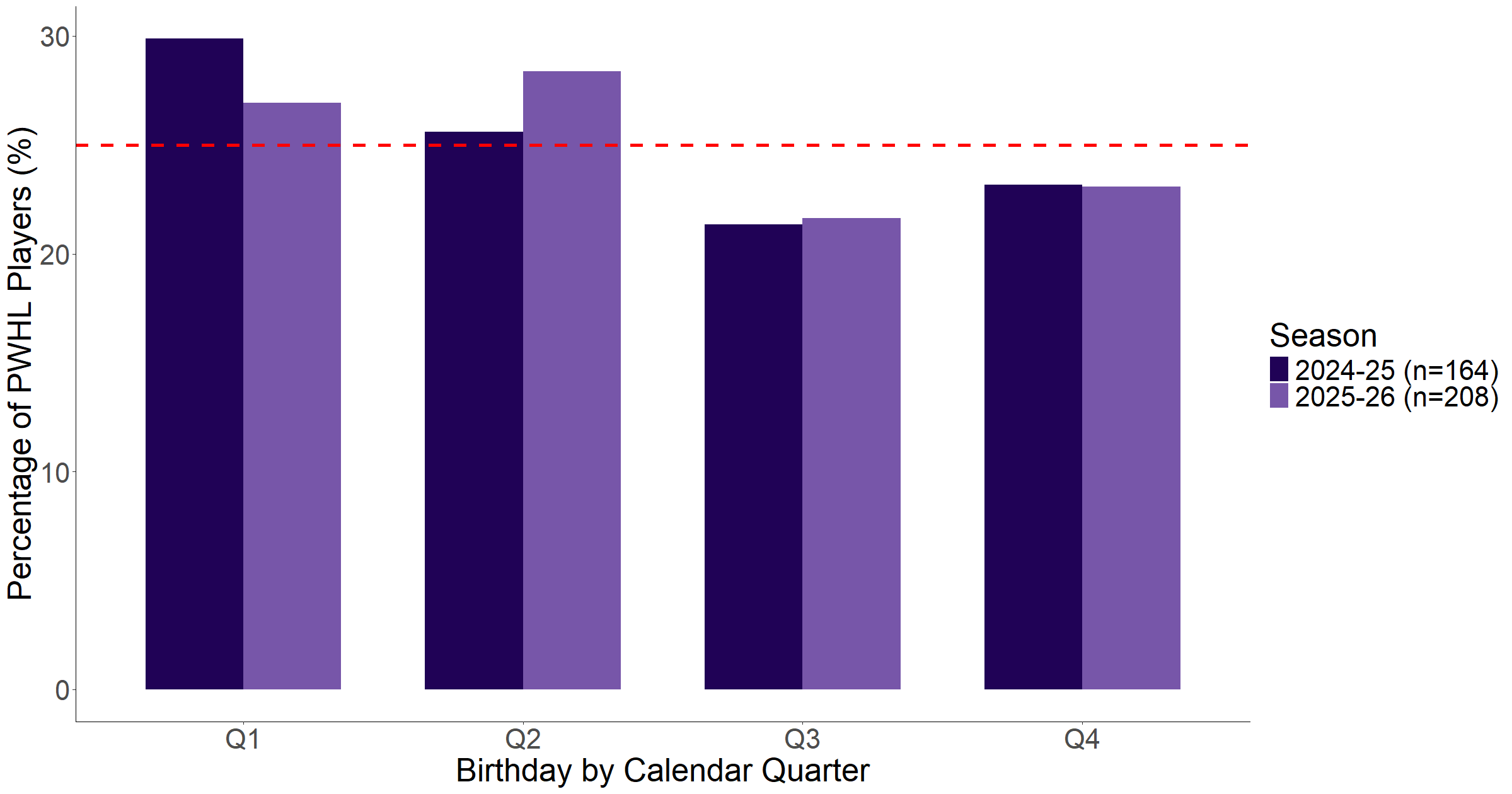 As is commonly done, we can divide birthdays into quarters of the calendar year to make the analysis more meaningful. Figure 1 shows the distribution of birth quarters in the PWHL pre-expansion (2024-25) and currently (2025-26).