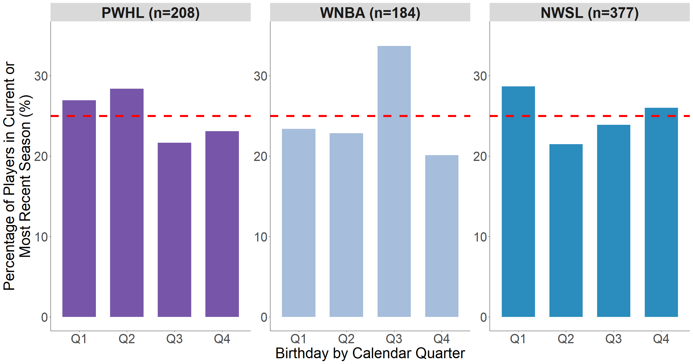 Now let’s broaden the scope and look at data from the most recent season of other professional women’s sports leagues in North America, specifically the Women’s National Basketball Association (WNBA) and National Women’s Soccer League (NWSL), in Figure 4. Although the WNBA has an overrepresentation of players born in Q3, there is minimal evidence of the RAE, with most of the variation appearing to be random, once again.