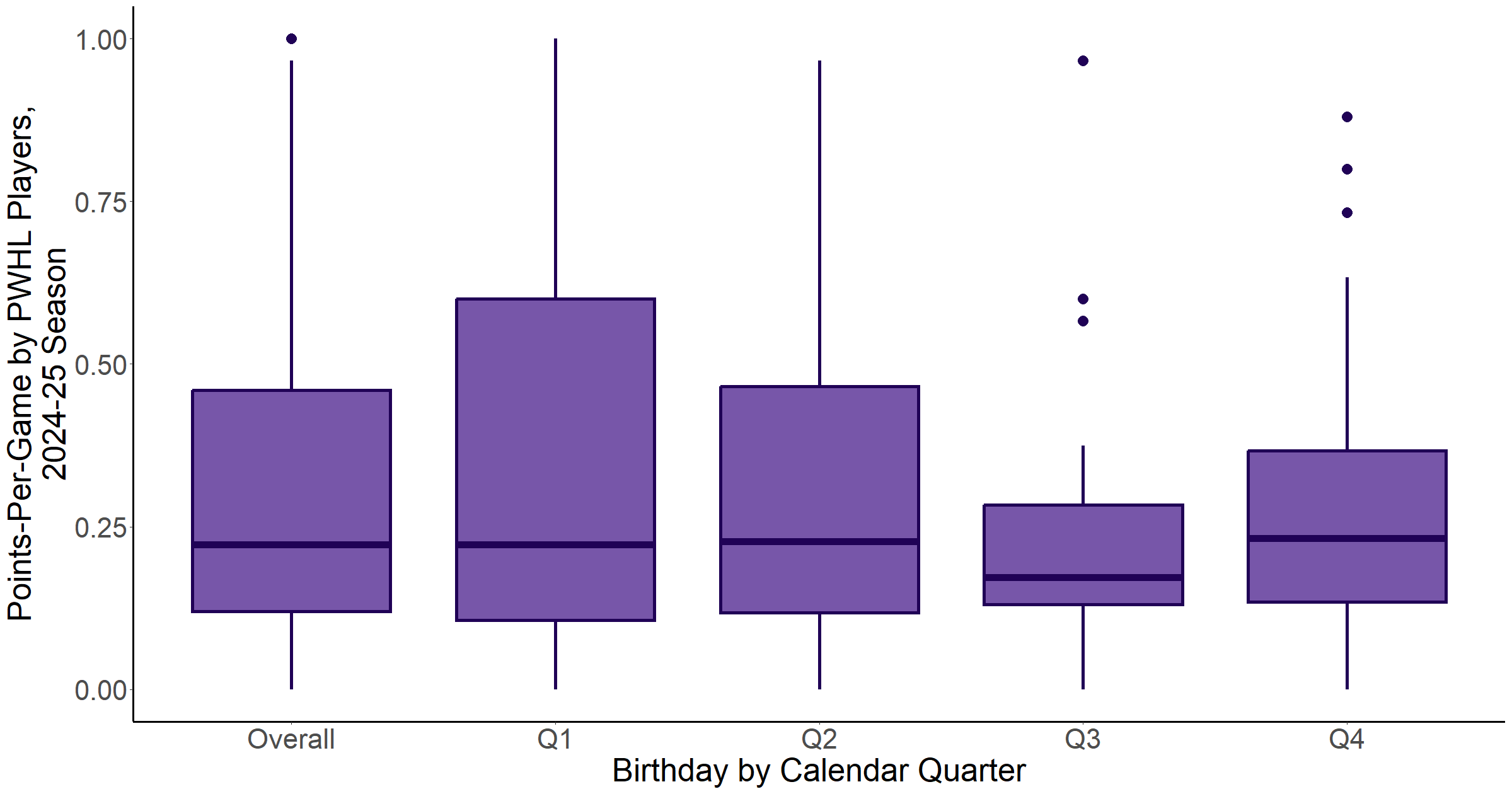 Visualizing points-per-game (PPG) across the 2024-25 season in Figure 5, there is some difference in the variation in this stat by birth quarter (indicated by taller boxes and longer lines extending from them), but the trend is still quite stable. Using linear regression to model the effect of birth quarter on PPG, we can account for other characteristics that might influence a skater’s performance, such as the team they play on, position they play, and age (i.e., birth year).*** Once again, birth quarter does not impact PPG in a statistically significant way. This is especially not surprising given the fluctuations in PPG pictured in Figure 5 – Q3 players seem to have a slightly lower PPG than Q1 and Q2 players, but performance bounces back among Q4 players.