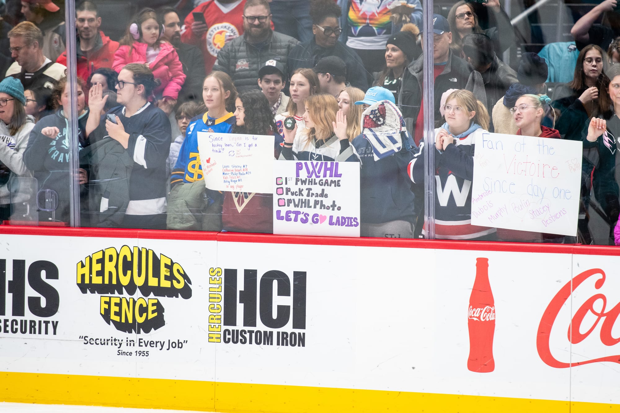 While walking around the concourse, a group of three friends caught my attention because of their jerseys from the PHF’s Boston Pride and hand-drawn signs with phrases like “I ♥ Girl Aquarium.” Longtime women’s hockey supporters, they traveled from Philadelphia to DC for the Takeover Tour. They were excited to watch women’s hockey at the highest level, especially in an arena as nice as Capital One and with the level of recognition and enthusiasm from the crowd. The community aspect of women’s hockey was important to the group. “We really enjoy watching hockey in all forms, and we really like how inclusive they are.”